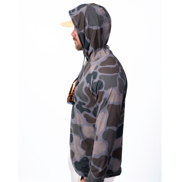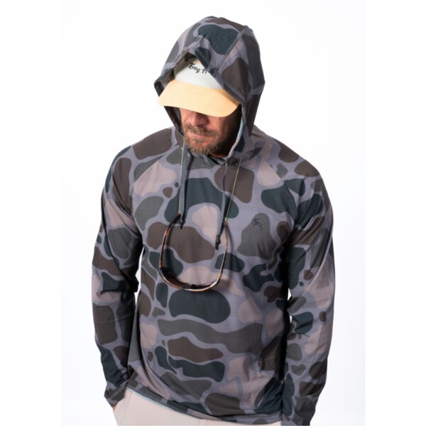 30+ UPF Oysterman Hoodie with Airmesh Technology designed to offer unmatched breathability, sun protection, thumbholes on the sleeve. There is also an oversized microfiber cloth for keeping your sunglasses clean and scratch free. Developed to be quick drying, functional, with a crossover hood with drawstrings that fits perfectly and stays in place making it the coolest sun shirt in the game!