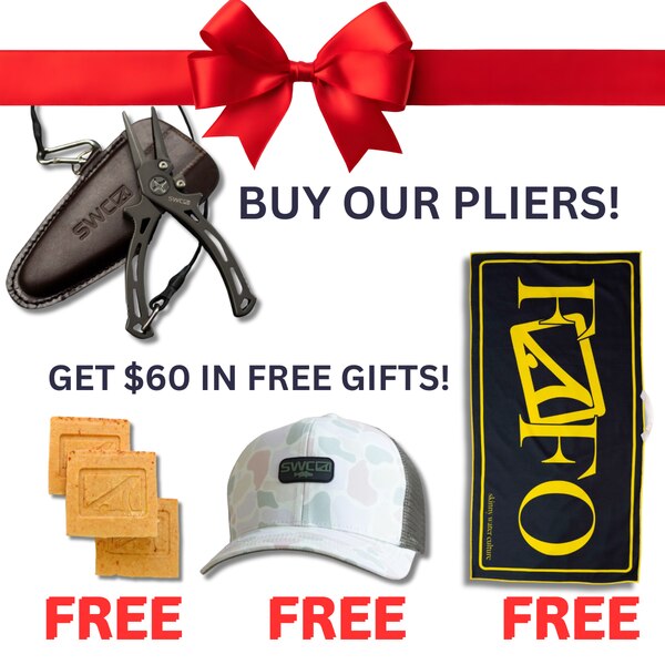 Equip your tackle kit with the Titanium Plier Kit, a rugged, saltwater-ready set that gives you precision, strength, and bonus gear for long days on the water. On top of the high-performance 6.5″ titanium pliers, you also get three free gifts (valued at $60): the FAFO Skiff Towel, a Bog Camo Oxford Trucker, and the Fishy Fingers Soap perfect companions for both on-boat utility and post-fishing recovery.