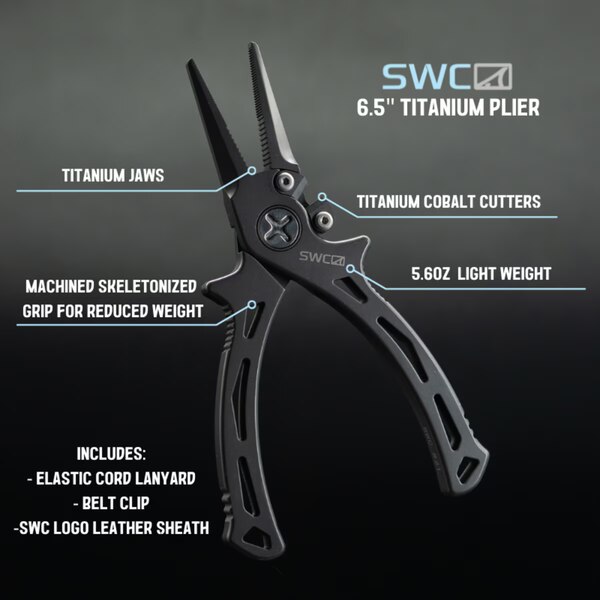 | SWC 6.5″ Titanium Pliers | • Length: 6.5″ • Weight: ~5.6 oz • Corrosion-resistant titanium construction • Replaceable titanium cutters • Skeletonized/machined grip for lightweight handling • Comes with a molded leather sheath and lanyard (per product packaging) |