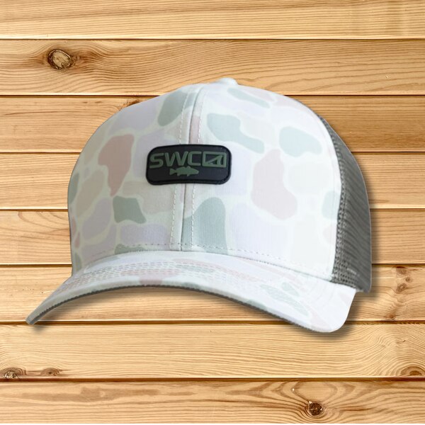 | SWC Trucker – Bog Camo | • 6-panel construction with a medium crown • Material: Poly twill front / performance mesh back • Structured bill; curve can be shaped by wearer • Snapback closure for adjustability • Drifter Crab woven-label detail at snap |